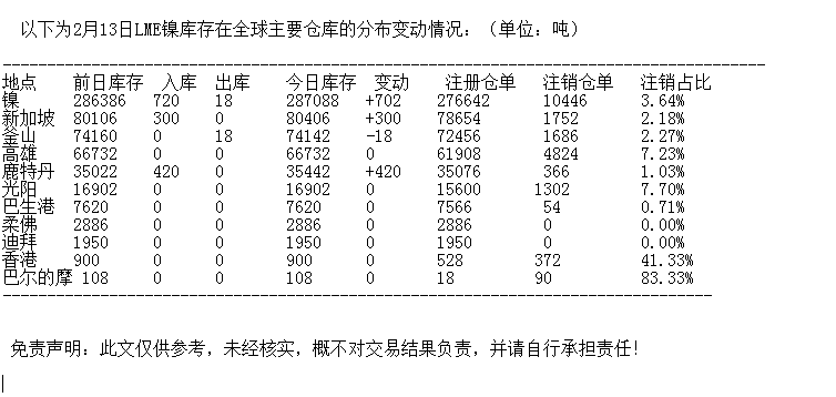 LME 2月13日镍库存分布情况